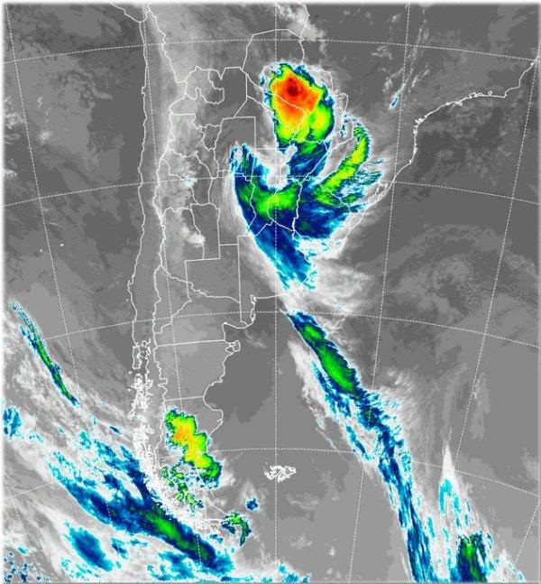 En la foto de satélite, vemos la vasta zona de influencia de la zona de baja presión. Por estas horas las principales tormentas se ubican en el centro del chaco paraguayo y en la provincia de Formosa, pero la actividad se mantiene latente con nubes de buen porte y con lluvias generalizadas en buena parte del litoral. No se están reportando, por el momento, tormentas intensas, pero es una jornada que tiene todo lo necesario para que las mismas se intensifiquen a lo largo del día, sobre todo en sectores de las provincias de ER, SF y Corrientes. En forma totalmente inconexa, el sur de la Patagonia, se mantiene afectada por lluvias que se suceden con una secuencia de ondas que transitan sobre esta zona.